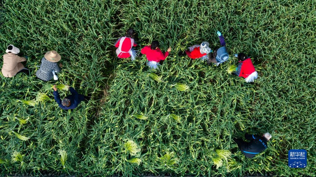在成都市温江区永宁街道八角社区,农民在蒜稻轮作田里采收蒜薹(3月23日摄,无人机照片)。新华社记者 沈伯韩 摄