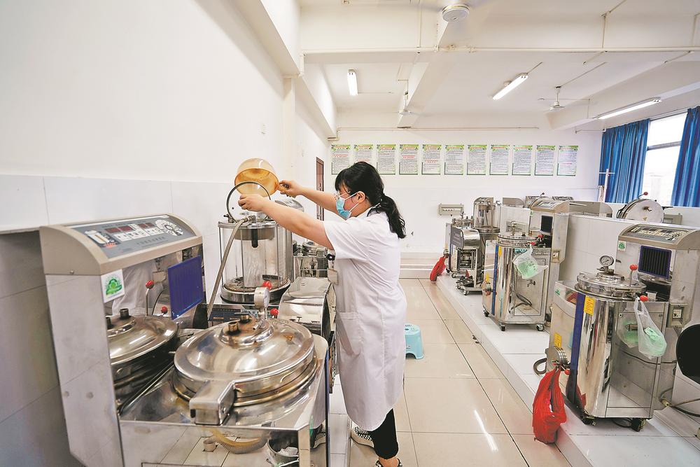 在沙县区总医院中药煎煮房,医护人员在为患者代煎中药,每日由专人专车送往下属分院。