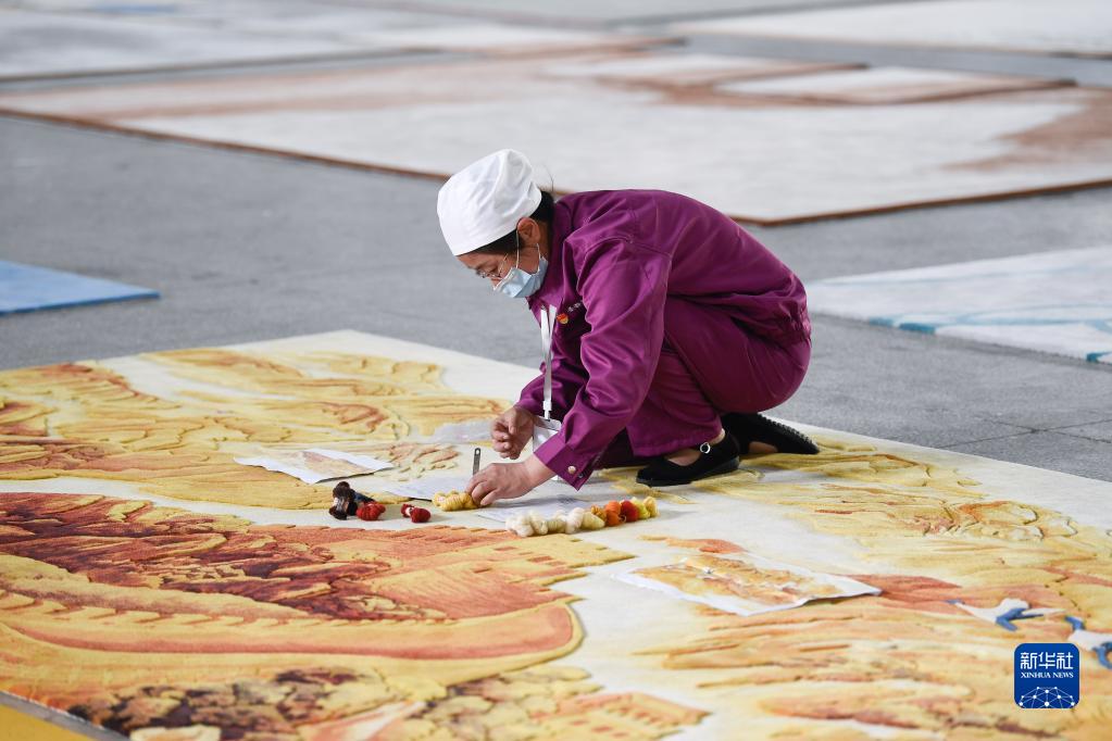 2021年6月7日,在青海圣源地毯集团有限公司生产车间内,工人在制作藏毯。新华社记者 张龙 摄