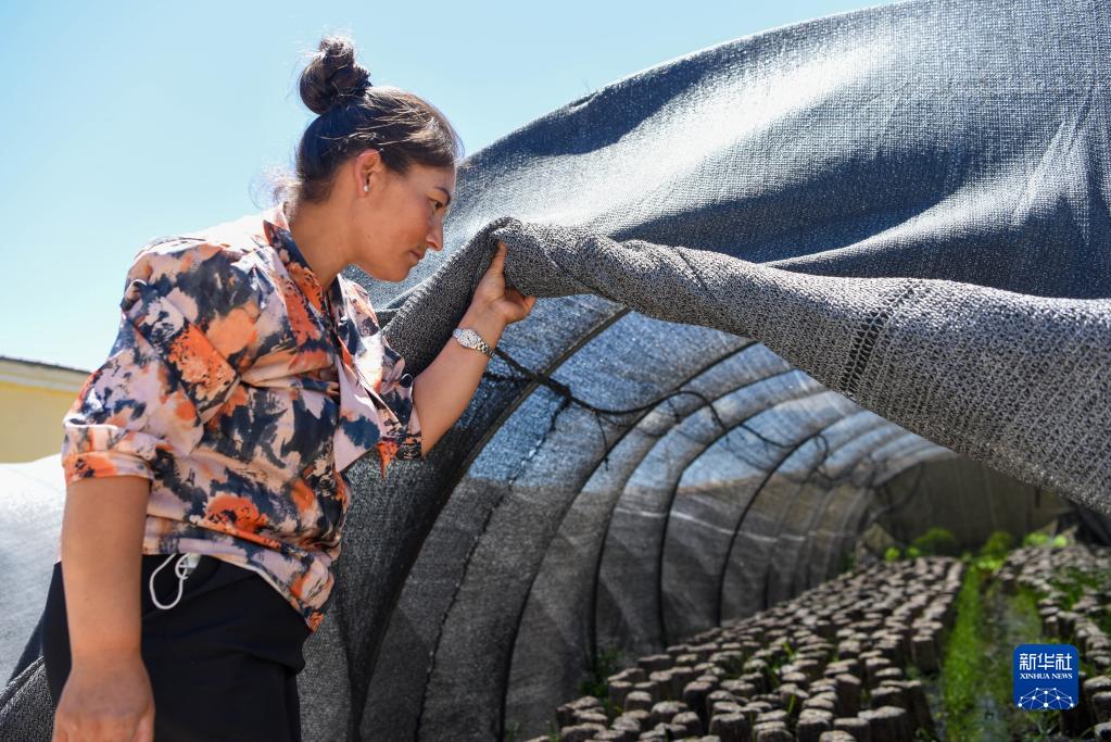 在新疆乌什县依麻木镇,在新疆维吾尔自治区党委组织部、老干部局驻托万克麦盖提村“访民情惠民生聚民心”工作队的帮助下,不少村民通过培植木耳增收致富(2022年6月7日摄)。新华社记者 丁磊 摄
