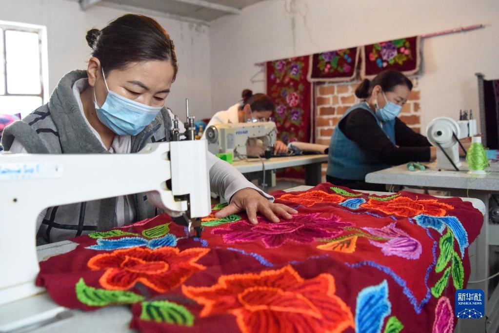 在新疆吉木萨尔县白泉村刺绣专业合作社,绣娘在制作哈萨克族刺绣(2021年1月23日摄)。新华社记者 丁磊 摄