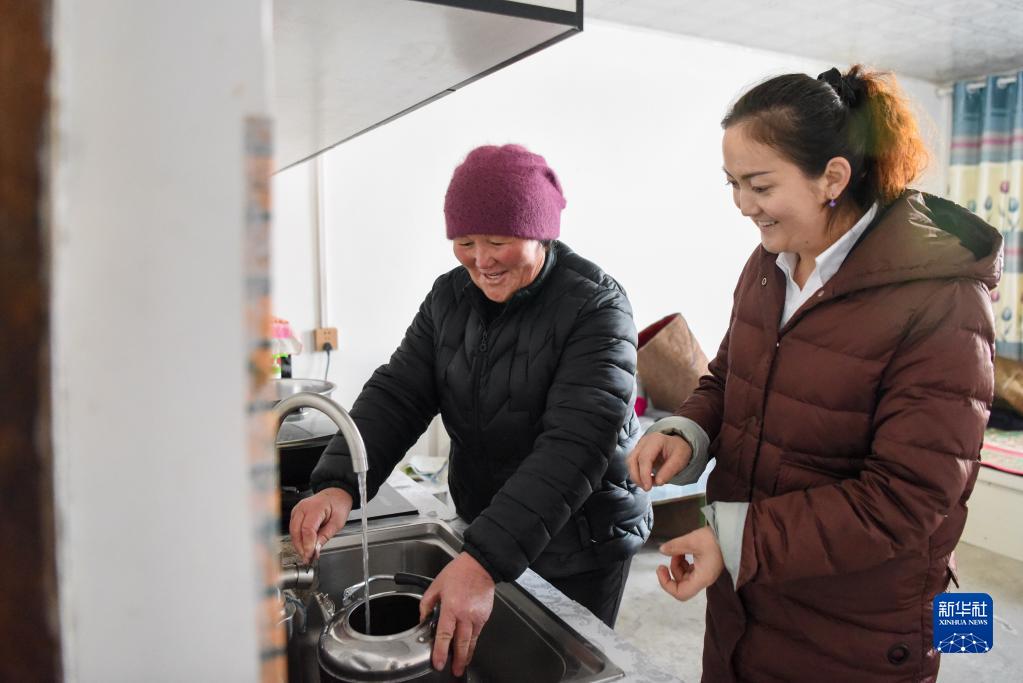 在新疆福海县解特阿热勒镇京什开萨尔村,村干部(右)来到前不久刚接通自来水的村民家中了解水质情况(2021年11月25日摄)。新华社记者 丁磊 摄