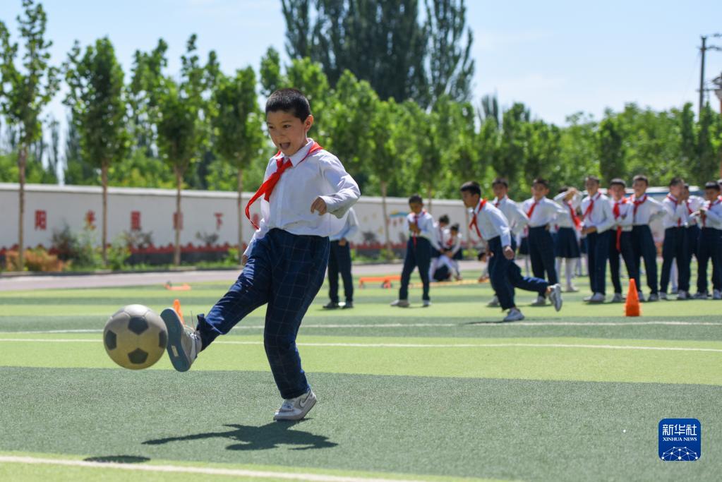 在新疆喀什地区疏附县托克扎克镇中心小学,学生们在上体育课(2022年6月10日摄)。新华社记者 丁磊 摄