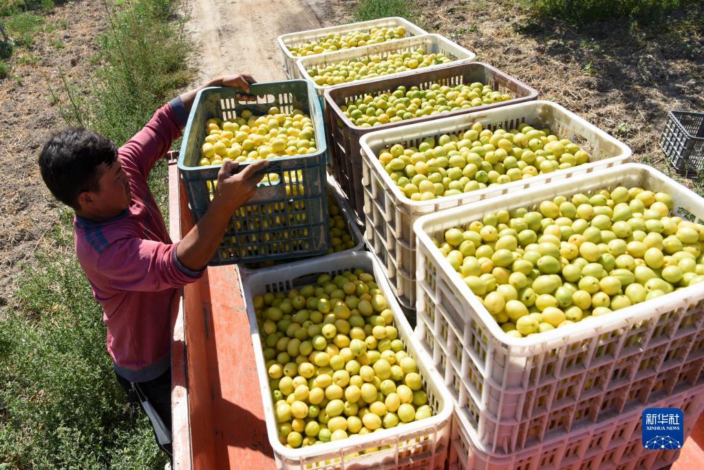 在新疆阿克苏地区库车市齐满镇齐满村,农户将采摘的小白杏装车(2021年7月1日摄)。新华社记者 丁磊 摄