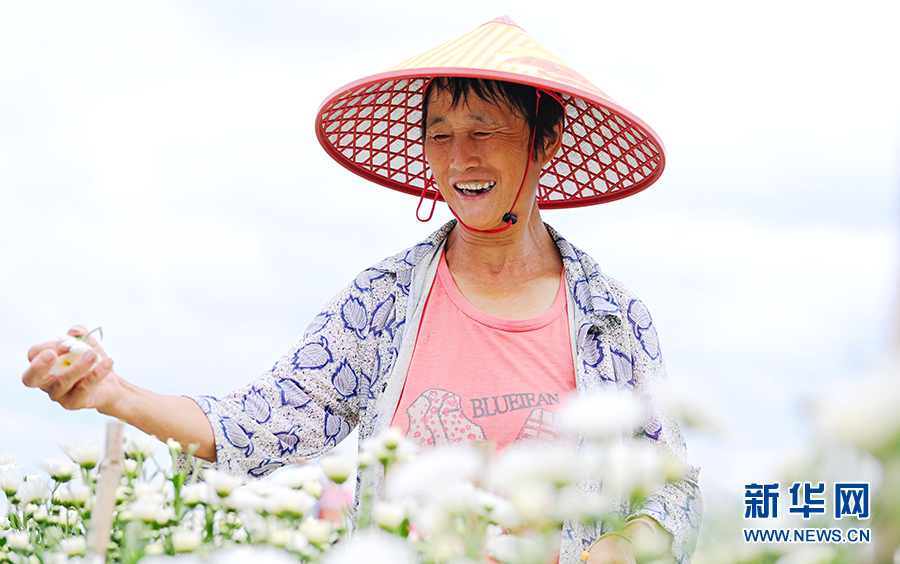 重庆市酉阳土家族苗族自治县丁市镇中坝村菊花种植基地内,当地种植的中草药材菊花进入采收期,图为当地村民正在采收菊花。新华网发(陈碧生 摄)
