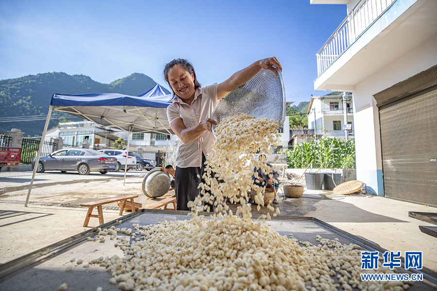 时下正值中药材贝母收获的季节,地处秦巴山区南麓的重庆市巫溪县兰英乡400余亩贝母陆续进入采收期,一位村民将贝母倒入烘干托盘。新华社记者 黄伟 摄