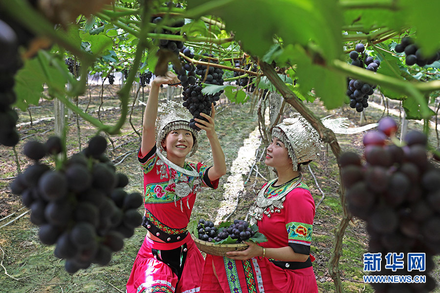 7月8日,身着苗族服装的游客在重庆市彭水苗族土家族自治县绍庆街道阿依河社区葡萄采摘园采摘葡萄,体验采摘的乐趣。新华网发(赵勇 摄)