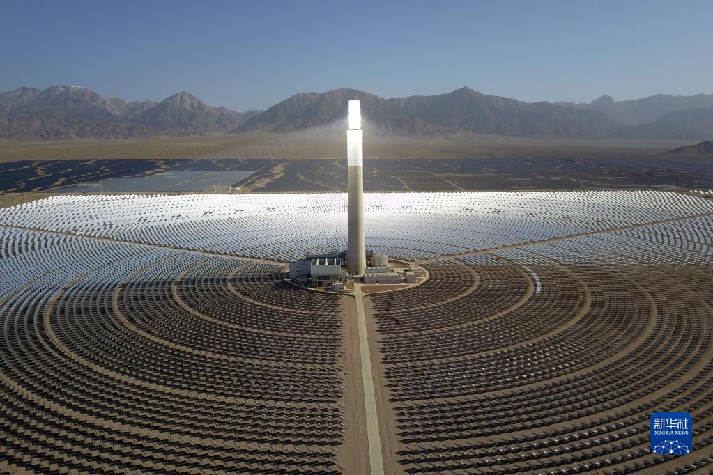 这是2022年6月8日在海西蒙古族藏族自治州德令哈市光伏(光热)产业园拍摄的青海中控德令哈50兆瓦光热电站(无人机照片)。新华社记者 范培珅 摄