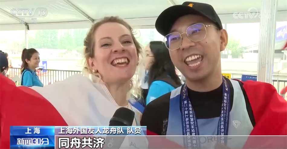 上海外国友人龙舟队队员称:“我们是一支国际化的参赛队伍,队员有法国人、中国人、哥伦比亚人、美国人、意大利人……我们有着很好的团队精神。今年是中法建交60周年,我们非常荣幸受到邀请,同舟共济。”