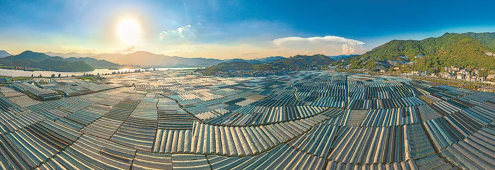 5日,即将进入大面积采收期的福安市赛岐镇象环村连片避雨设施葡萄园,在晨光映衬下呈现“百里葡萄海、万民致富园”的景象。李郁 陈雅芳 摄