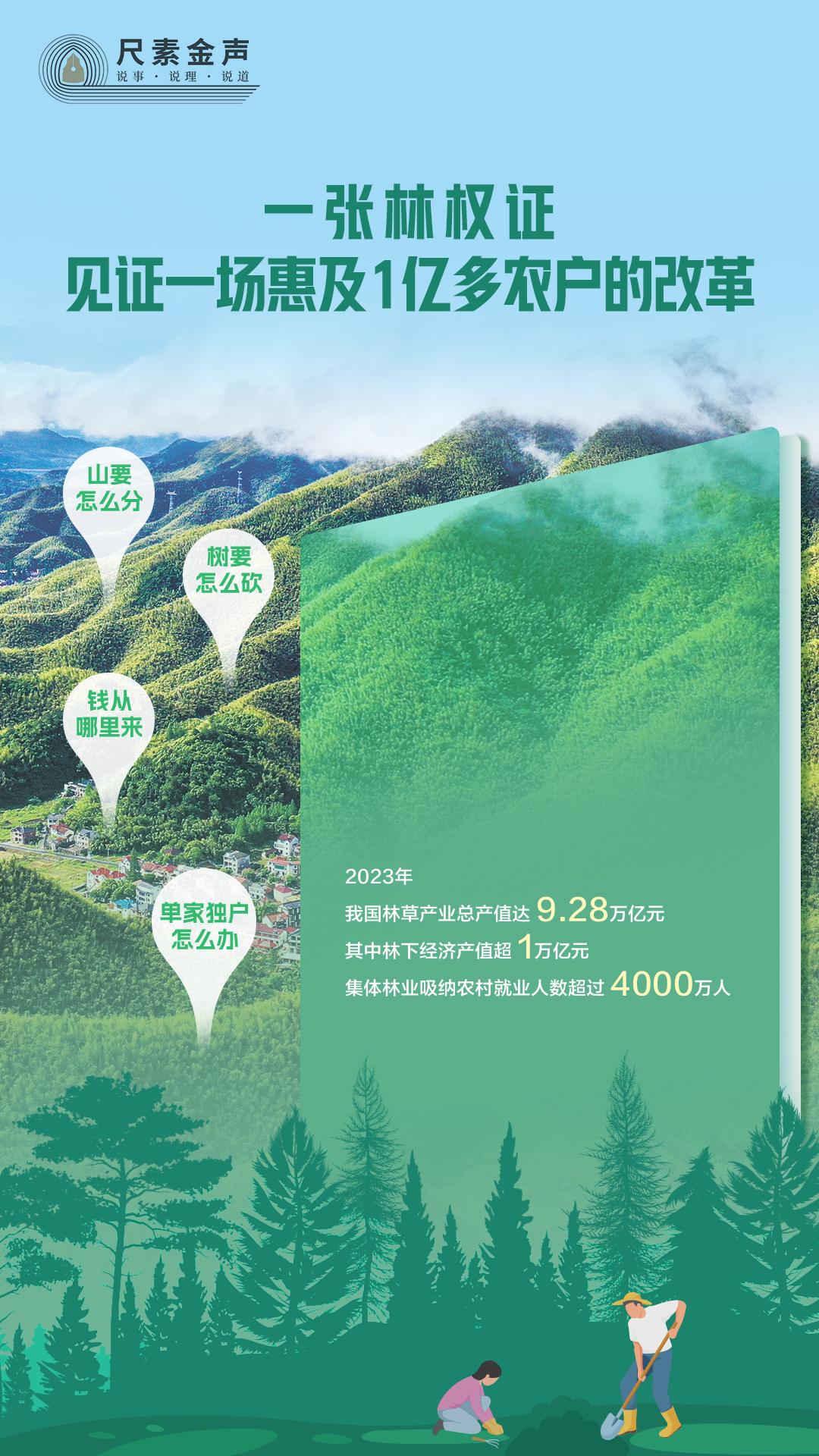 林改,改出了满目青山,改出了金山银山,广大集体林区发展添活力,亿万林农鼓腰包。去年,我国林草产业总产值达9.28万亿元,其中林下经济产值超1万亿元,经济林产量达2.26亿吨,成为继粮食、蔬菜之后的第三大农产品,集体林业吸纳农村就业人数超过4000万人。