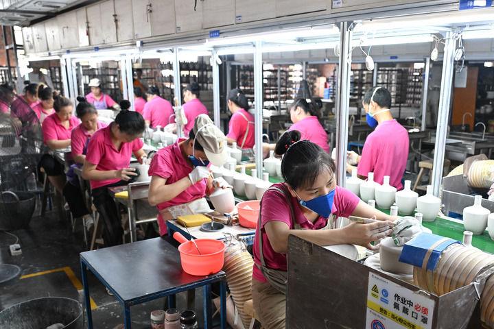 2024年7月27日,湖南醴陵银和瓷业有限公司的员工在酒瓶生产的水洗线上工作。新华社记者 李鑫 摄