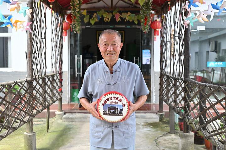 2024年7月25日,安徽凤阳小岗村“大包干”带头人严金昌在自家开办的农家乐里展示小岗村旅游纪念品凤阳花鼓。新华社记者 李鑫 摄