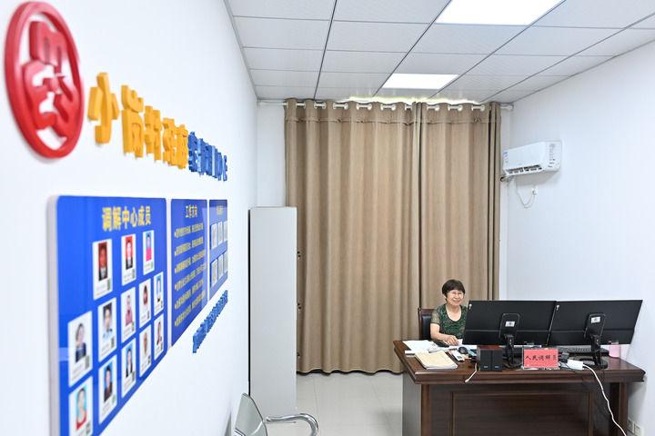 2024年7月25日,安徽凤阳小岗村人民法庭家事调解中心调解员缪永贤通过网络连线进行婚姻调解。新华社记者 李鑫 摄
