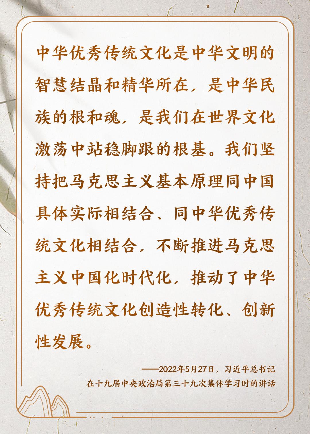 中华优秀传统文化,是我们培养个人情操、站稳心中理想的“根与魂”,是一首千古传诵的诗。仰望明月时,我们心怀“人生得意须尽欢”的通透;漫步山野时,我们共享“山重水复疑无路”的体验;参观文物时,我们想象“黄沙百战穿金甲”的传奇。千载岁月悠悠,优秀传统文化生机勃勃、不断发展。