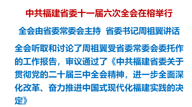 全会听取和讨论了周祖翼受省委常委会委托作的工作报告,审议通过了《中共福建省委关于贯彻党的二十届三中全会精神,进一步全面深化改革、奋力推进中国式现代化福建实践的决定》。周祖翼就《决定(讨论稿)》向全会作了说明。