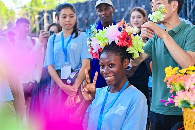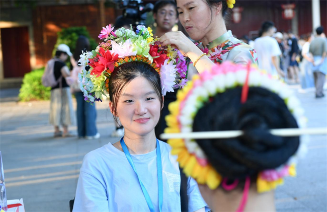 簪花围,是备受选手们期待的项目。来自尼日利亚的珍桂说:“给我簪花的叔叔告诉我,他是第一次给我这种辫子做簪花造型,一开始还担心做不了,没想到最后做成了,非常漂亮,我太开心了!”
