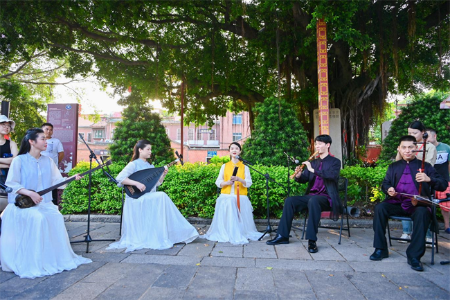 府文庙前,选手们分为五组,轮番体验了南音、簪花围、高甲戏、拍胸舞、泉州木偶戏五种国家级非物质文化遗产项目。