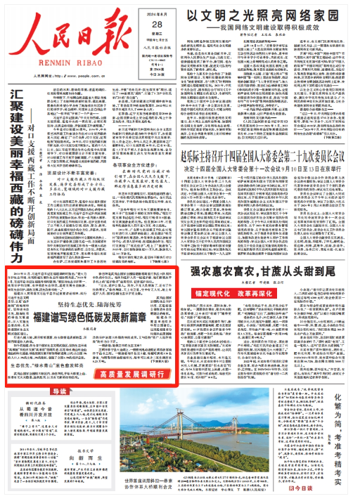 8月28日,人民日报头版“高质量发展调研行”专栏刊发通讯《福建谱写绿色低碳发展新篇章》,点赞福建生态优先、陆海统筹,坚持生态环境“高颜值”和经济发展“高素质”协同共进,拓宽绿水青山向金山银山的转化通道,绿色低碳发展不断取得新进展。