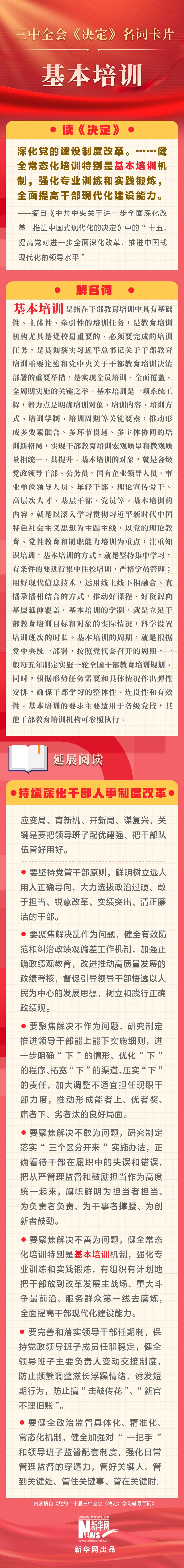 党的二十届三中全会审议通过了《中共中央关于进一步全面深化改革、推进中国式现代化的决定》。新华网依据《党的二十届三中全会〈决定〉学习辅导百问》,制作三中全会《决定》系列名词卡片,和大家一起来深入学习领会二十届三中全会精神。本期名词是“基本培训”。