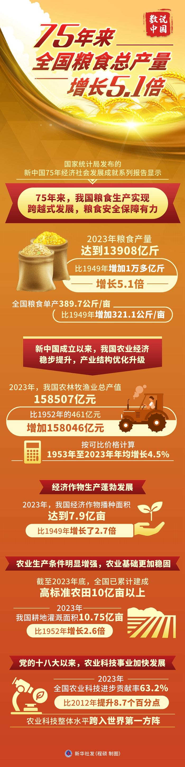 2024-09-12 17:13:53 来源:新华网原标题:75年来全国粮食总产量增长5.1倍