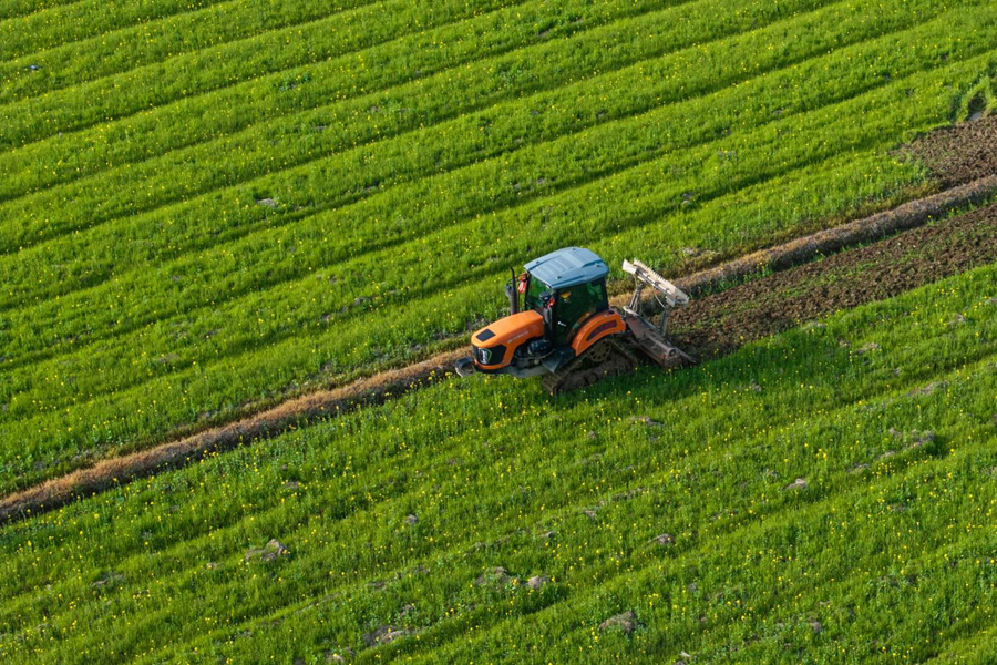 2024年3月19日,在湖南省常德市鼎城区谢家铺镇港中坪村,村民驾驶农机翻耕田地(无人机照片)。新华社记者 陈思汗 摄
