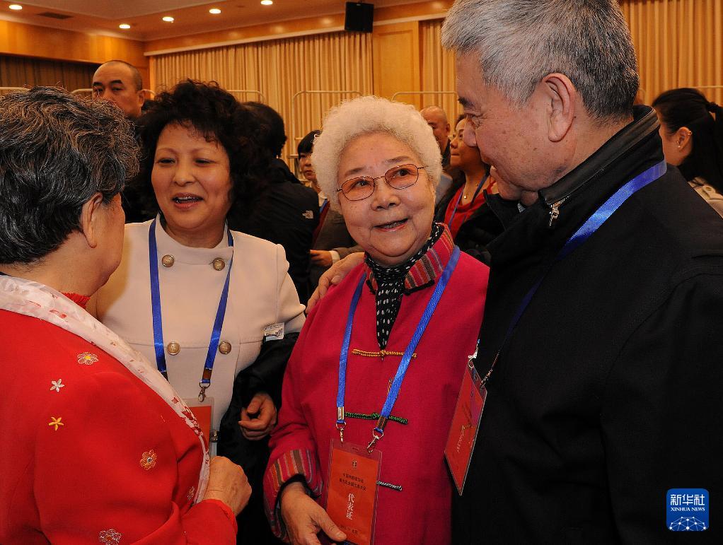 2013年11月29日,中国电影家协会第九次全国代表大会在北京开幕。这是田华(右二)在会议间隙与其他代表交流。新华社记者 何俊昌 摄