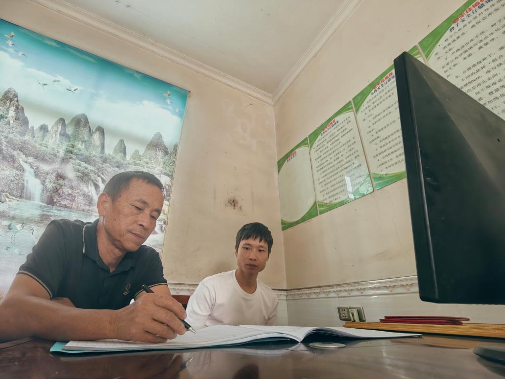 一批稻谷交易完成后,钟德军(左)和钟灿在算账。新华社记者周勉 摄