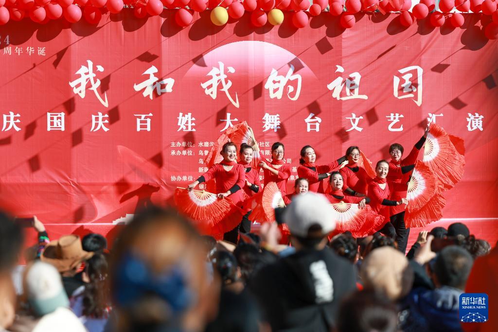 9月29日,在位于乌鲁木齐市水磨沟区的水塔山公园,辖区居民载歌载舞迎接国庆。