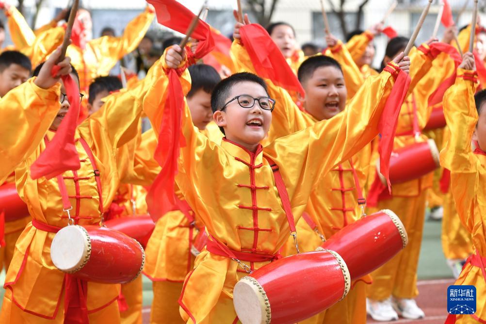 9月29日,在山东青岛重庆路第三小学开展的迎国庆主题展演活动上,孩子们进行腰鼓表演。