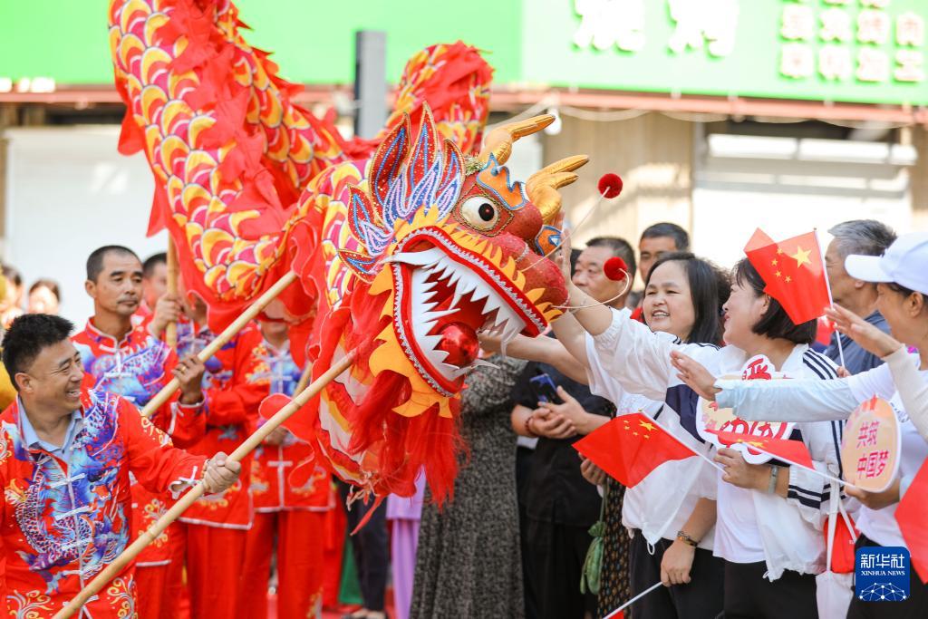 9月29日,在山东省青岛市李沧区浮山路街道金液泉路社区开展的国庆主题活动上,民间艺人舞龙与市民互动。