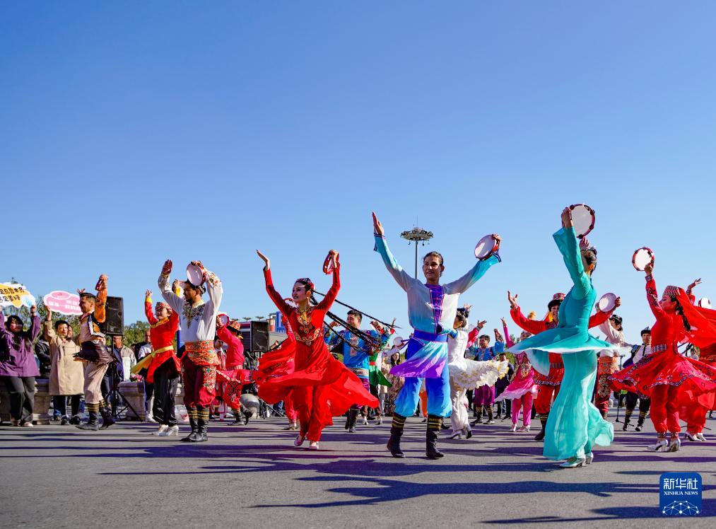 9月29日,在乌鲁木齐地窝堡国际机场T3航站楼外广场上,乌鲁木齐市艺术剧院演员进行民族歌舞表演。