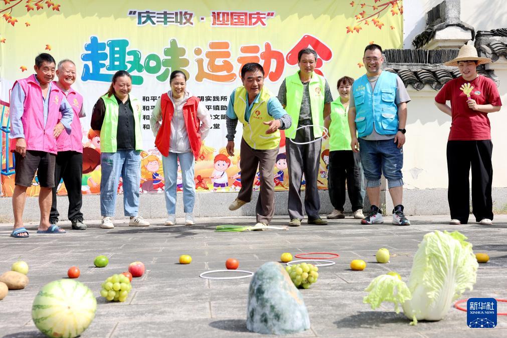 9月29日,在浙江省湖州市长兴县和平镇横山村,村民在“庆丰收·迎国庆”趣味运动会上进行蔬果套圈比赛。