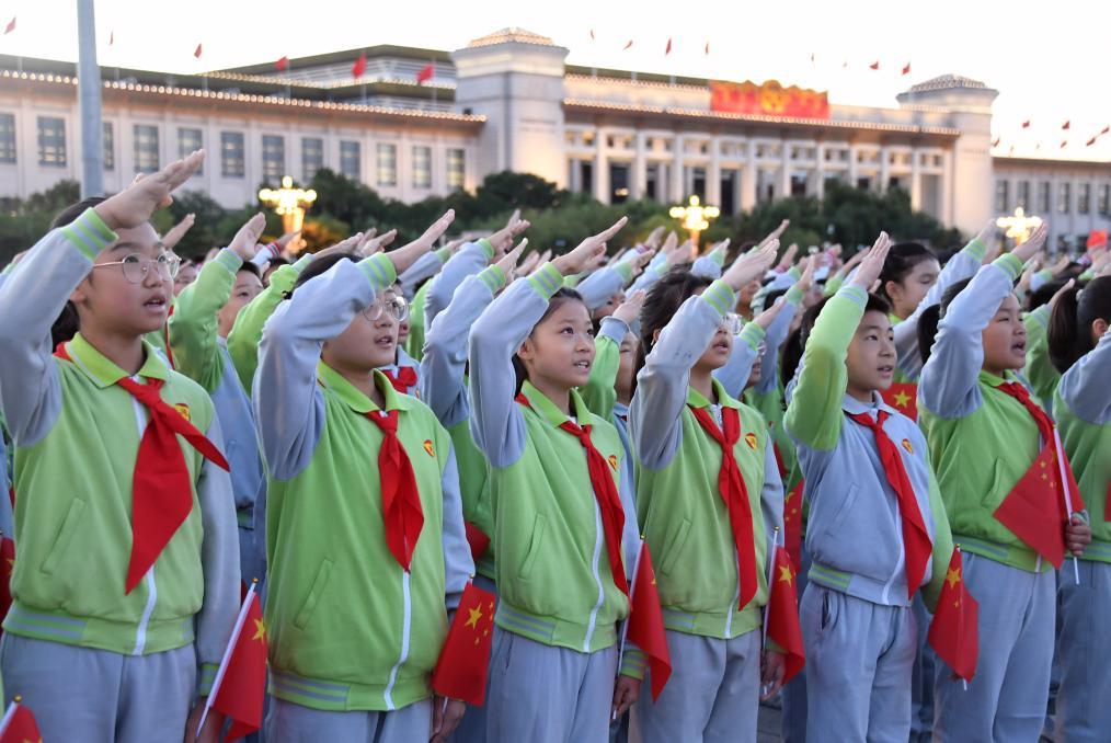 10月1日清晨,隆重的升国旗仪式在北京天安门广场举行,庆祝中华人民共和国成立75周年。这是少先队员向国旗敬礼。新华社记者 任超 摄