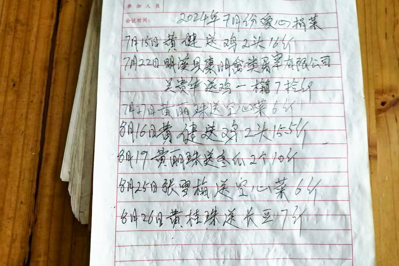央视网消息(记者 陈丽霞)“8月16日,黄健送鸡2只共15.5斤;8月25日,张雪梅送空心菜6斤;8月26日,黄桂珠送长豆7斤……”翻开“好人好事记录本”,几十页的本子密密麻麻地记录着村民们送来的各类爱心物资。这些文字不仅仅是食材名称与数量的简单堆砌,更在无声讲述三明市明溪县沙溪乡梓口坊村村民们对“老吾老以及人之老”传统美德的深刻理解。