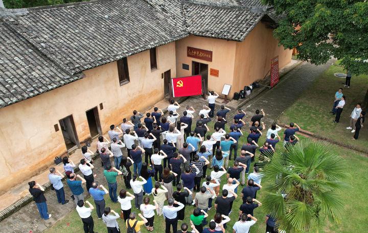 参观者在江西省瑞金市叶坪革命旧址参加活动(2024年5月30日摄,无人机照片)。新华社记者 万象 摄