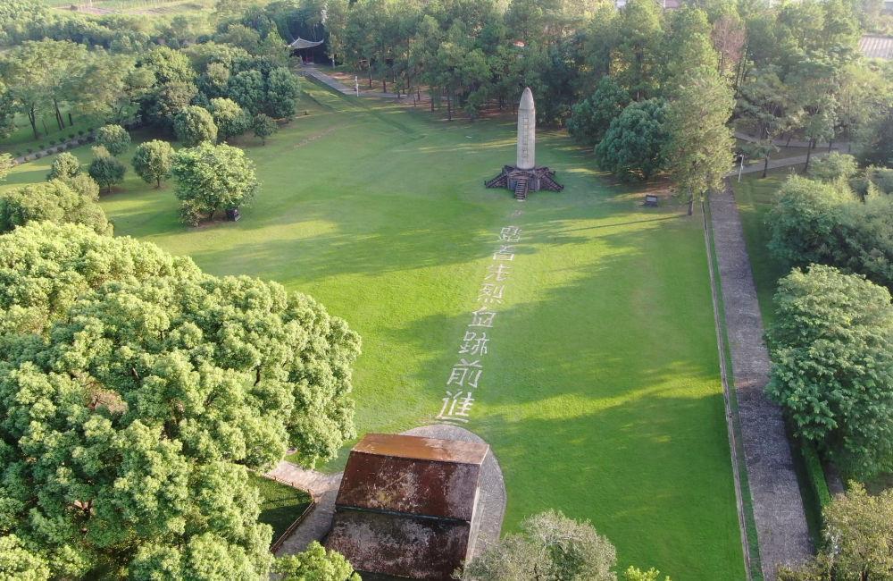 江西省瑞金市叶坪红军广场,瑞金红军烈士纪念塔巍然耸立,地面上有“踏着先烈血迹前进”八个遒劲大字(2024年9月11日摄,无人机照片)。新华社记者 余刚 摄
