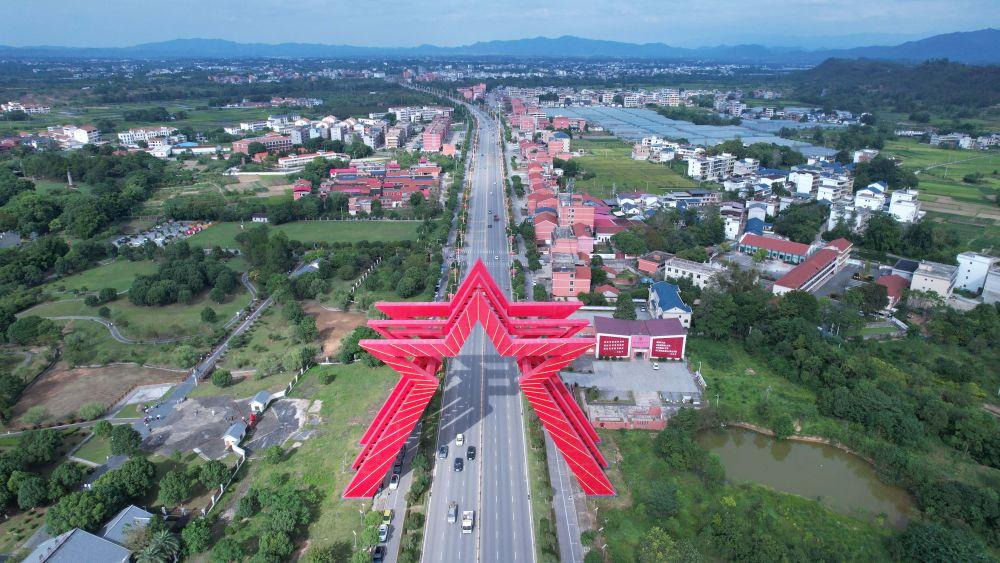 位于江西省瑞金市叶坪革命旧址群附近的“胜利之门”雕塑(2024年10月2日摄,无人机照片)。新华社发(邓浩亭 摄)