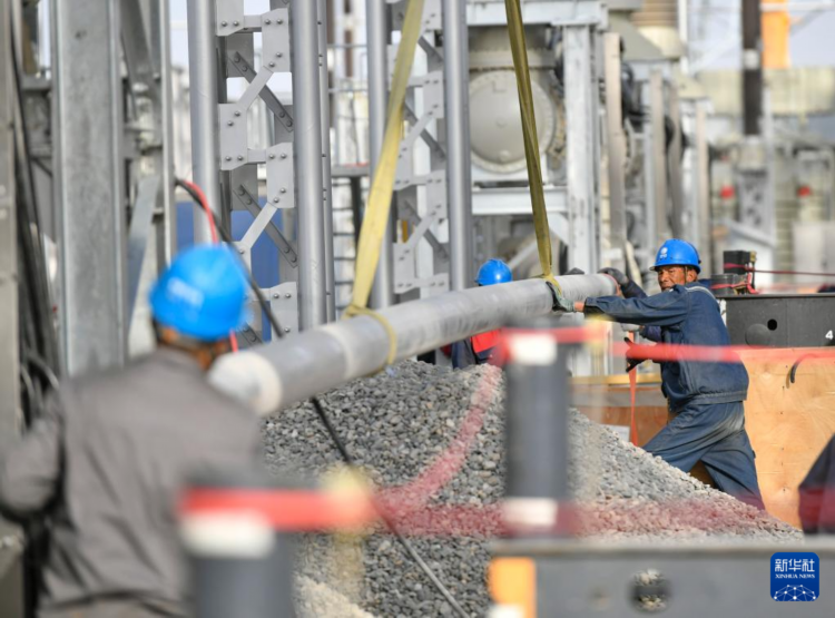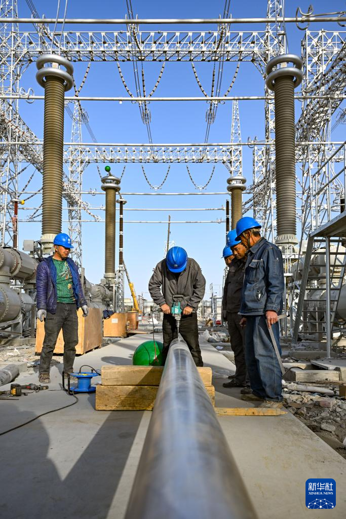 工人在新疆民丰750千伏变电站施工现场作业(11月10日摄)。