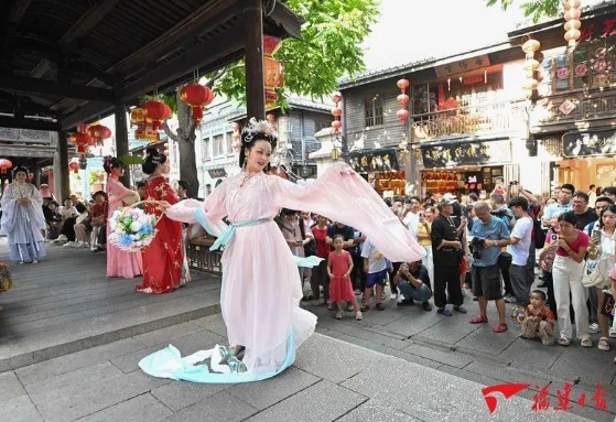 中秋假期,福州三坊七巷历史文化街区热闹非凡,闽剧跨界表演、国潮主题表演、非遗艺术展演以及街头艺术表演轮番上演,为游客和市民带来了丰富的节日体验。福建日报记者 游庆辉 摄