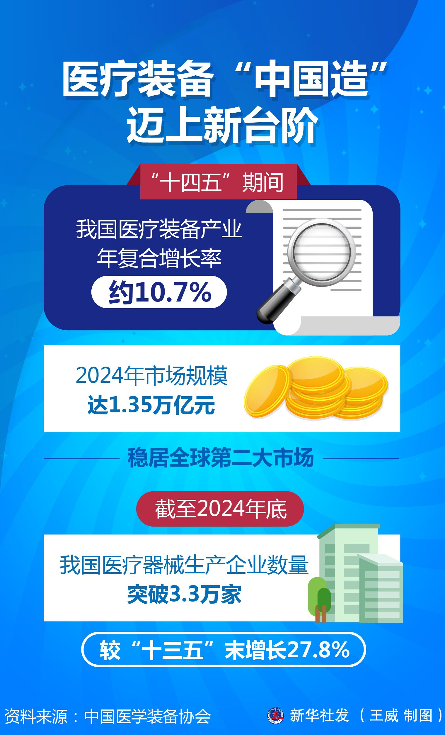 “‘十四五’期间,我国医疗装备产业年复合增长率约10.7%,2024年市场规模达1.35万亿元,稳居全球第二大市场。”中国医学装备协会理事长侯岩介绍,截至2024年底,我国医疗器械生产企业数量突破3.3万家,较“十三五”末增长27.8%。
