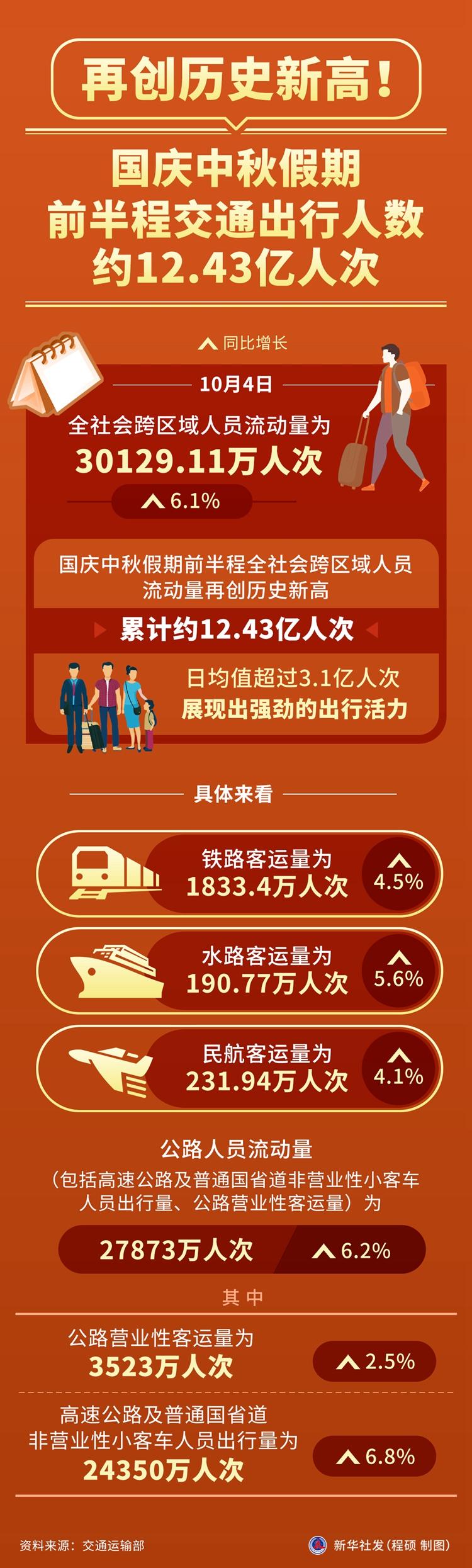 2025-10-06 09:52:12 来源:新华网原标题:再创历史新高!国庆中秋假期前半程交通出行人数约12.43亿人次