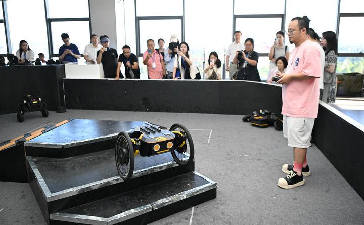 2025年6月23日,在广东东莞松山湖XbotPark机器人基地,本末科技工作人员操作机器人爬楼梯。新华社记者 邓华 摄