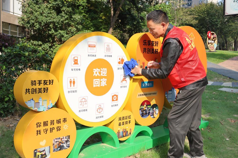 陈卓在擦洗天鹅塘社区的标牌。(余洋摄)