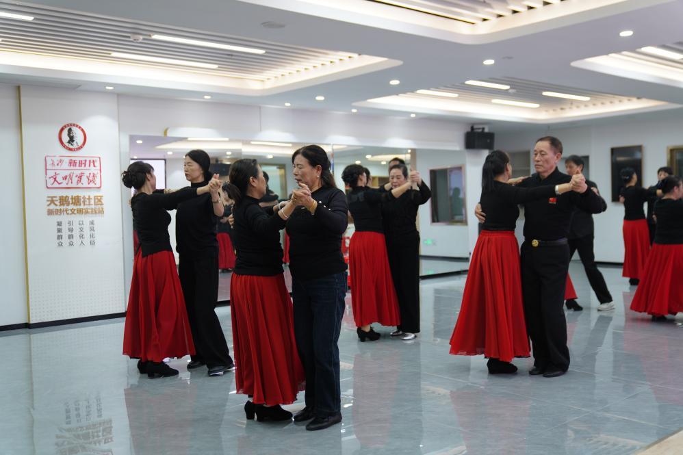 老年大学学员在天鹅塘社区参加交谊舞课程。新华社记者戴明轩摄