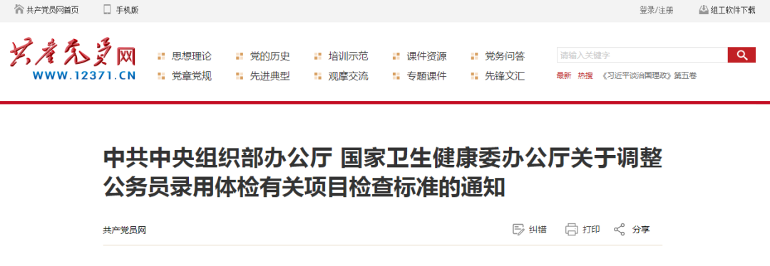 共产党员网11月14日发布《中共中央组织部办公厅 国家卫生健康委办公厅关于调整公务员录用体检有关项目检查标准的通知》: