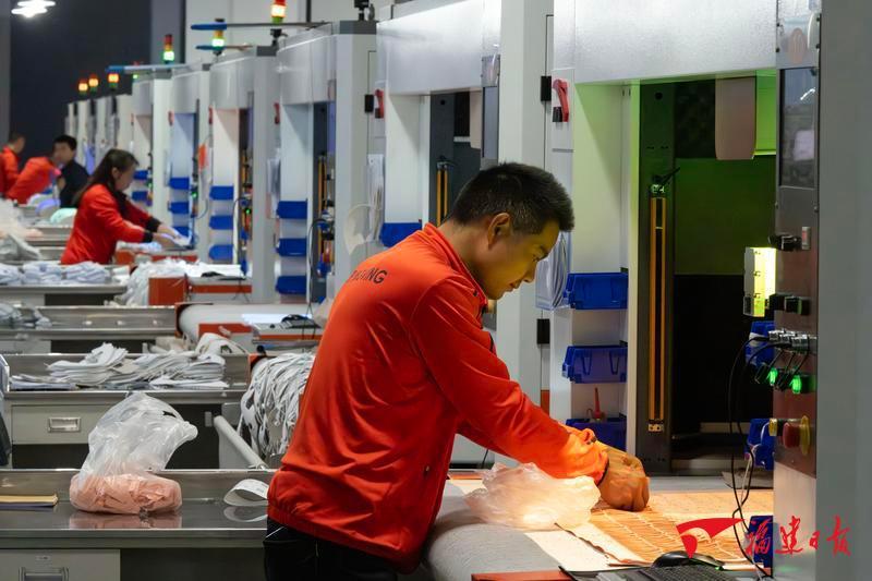 安踏自动化裁切车间里,工人操作自动化裁断机制作鞋面。福建日报记者 王毅 摄