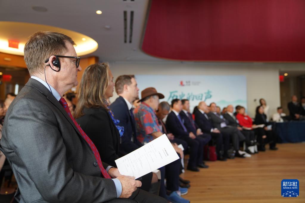 11月25日,在美国纽约举行的2025鼓岭论坛上,史迪威家族代表、史迪威将军外孙特里·史蒂文·考克斯(左一)分享先人与中国人民共同抗战的历史。新华社记者张凤国摄