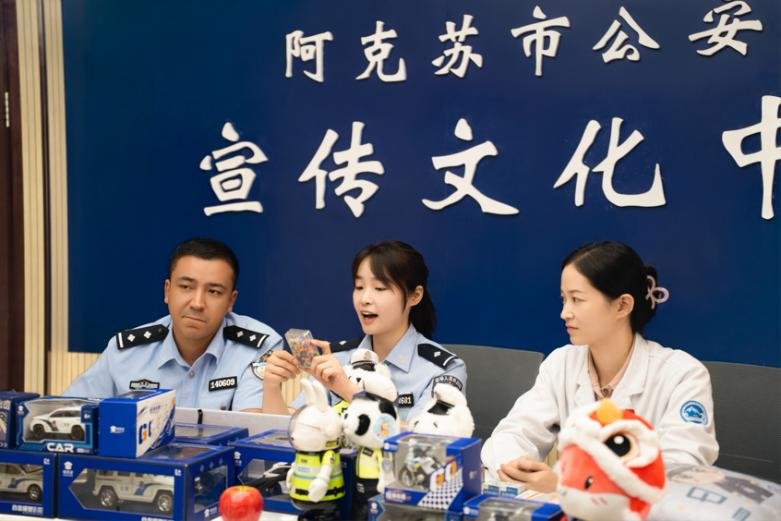 这是在2025年“禁毒宣传月”期间新疆阿克苏公安局刑事侦查大队禁毒大队民警龚鑫钰(中)联合市局公安文化宣传中心、市人民医院开展禁毒宣传直播活动。