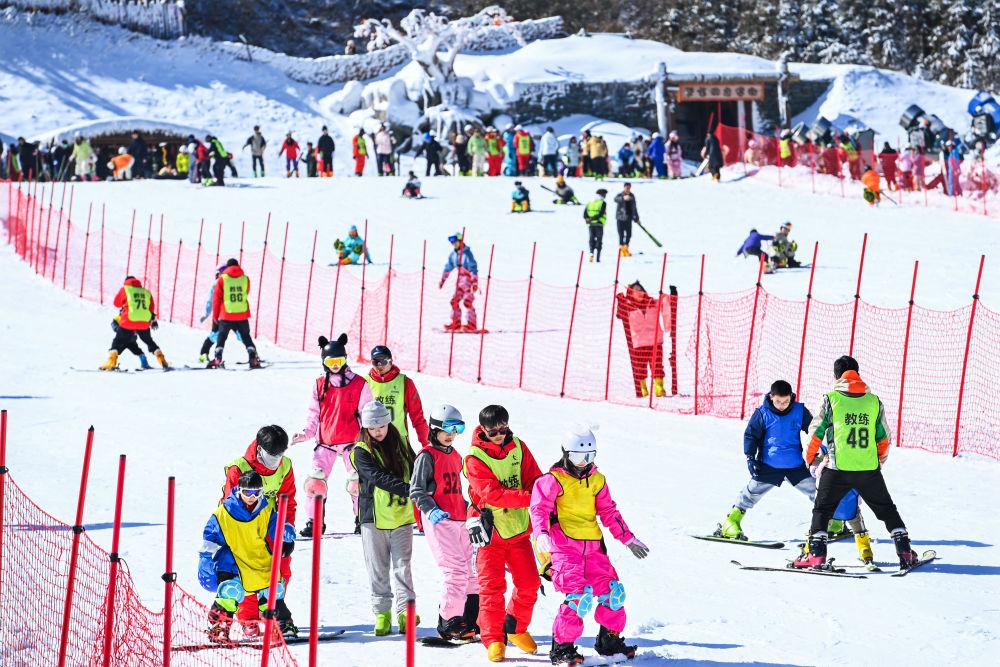 2026年2月2日,在江西省宜春市铜鼓县排埠镇七星岭滑雪场,参加冰雪冬令营的学生在教练的带领下体验冰雪运动。新华社发(周亮摄)